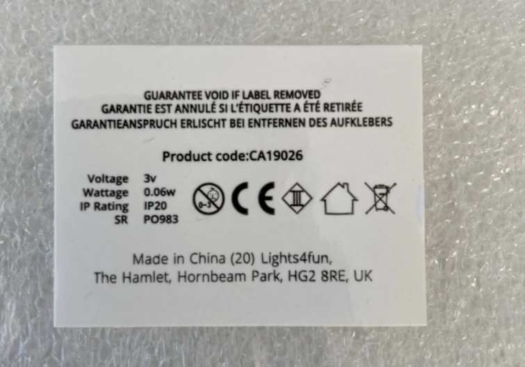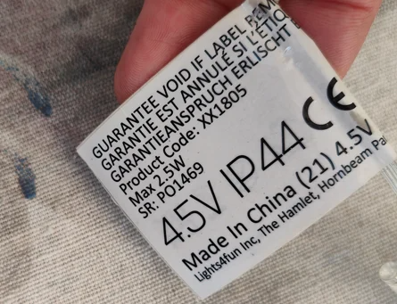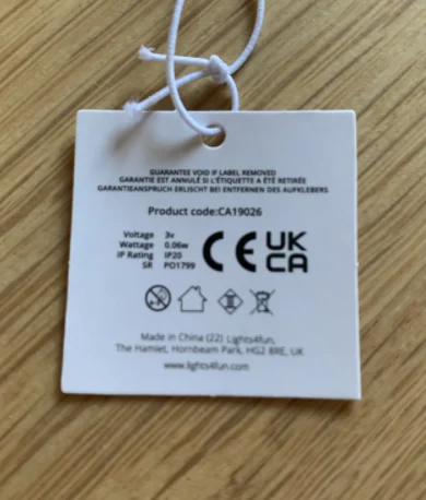 For battery-operated or mains-powered products, the label is located on the power cable and is plastic-coated (sometimes silver in colour). Here is an example: